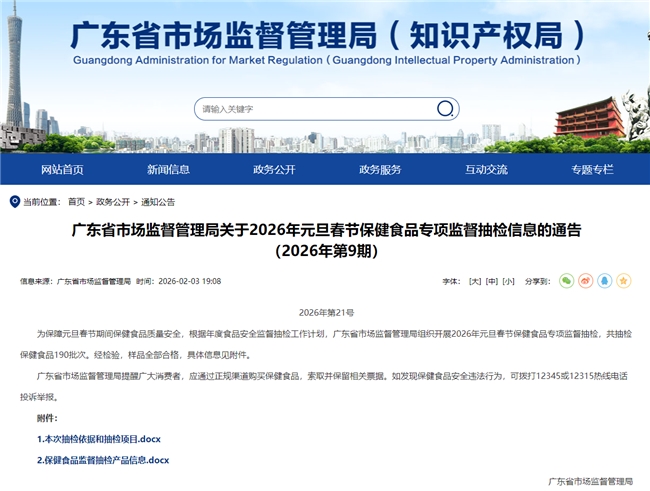 根据《中华人民共和国食品安全法》及其实施条例等有关规定和广东省食品安全监督抽检计划安排,为保障元旦春节期间保健食品质量安全,广东省市场监督管理局组织开展2026年元旦春节保健食品专项监督抽检,共抽检保健食品190批次。